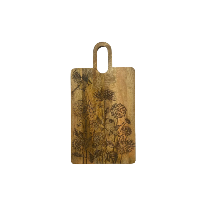 Skärbräda i mangoträ med svart blommönster och fågelmotiv. Skärbrädan kan även användas som ett fat vid exempelvis tapasservering. En bra presentidé eller för lite självöverseende.