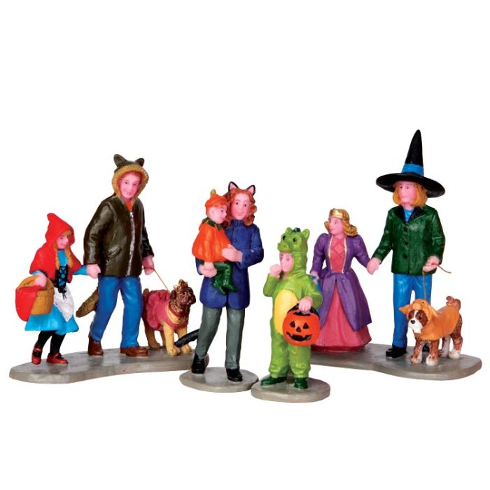 Bus eller godis. Föräldrar med sina barn i skrämmande halloweendräkter är redo att gå runt i staden och "trick-or-treat" för godis.