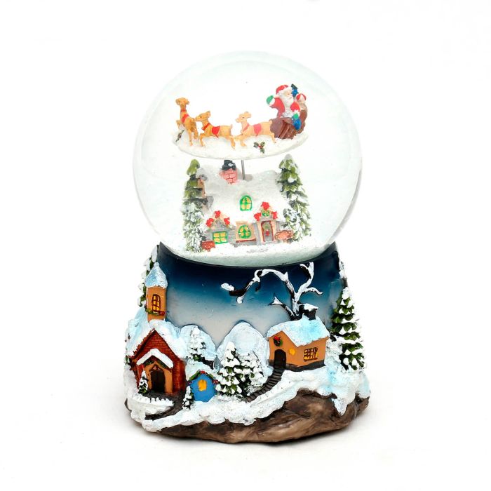 Snöglob Tomte på släde. Tomten kan svänga runt i sin släde och en jullåt spelas. I denna "snöglob" är det inte så mycket snö på grund av mekaniken som får släden att svänga runt.