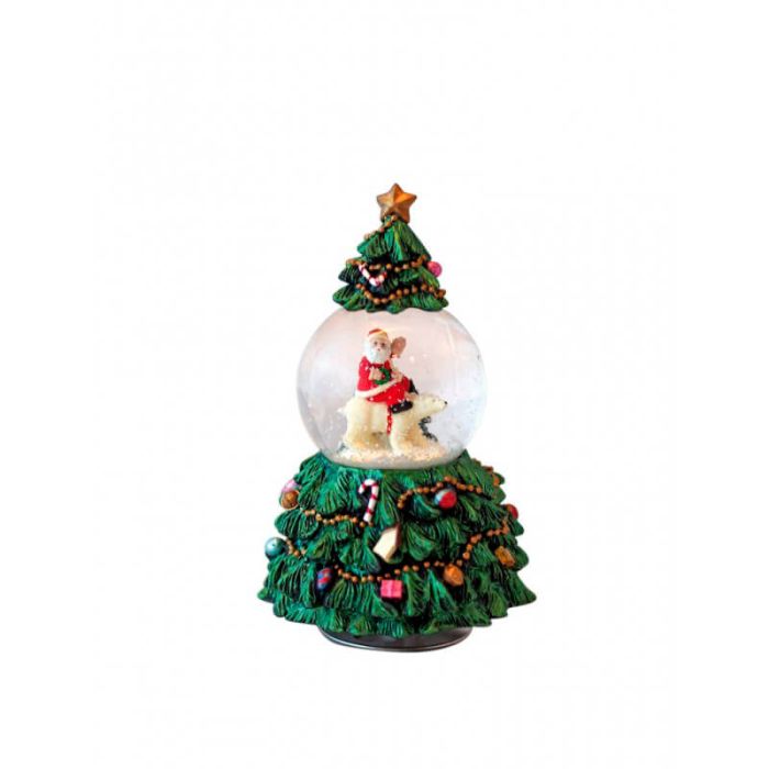 Snöglob Julgran med isbjörn. Julgran med kula i mitten av trädet. I kulan rider jultomten på en isbjörn. Julgranen kan snurra runt på sig själv. Den tyska julsången "O Tannenbaum" spelas.