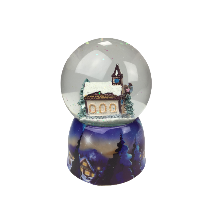 Snöglob med kyrkan. Framför stadens gamla kyrka spelar två tjejer en snöbollskamp med snögubben mellan sig. Det finns både snö och glitter i snökulan. Sockeln är målad med ett kvällsmotiv av en stad över vilken jultomten svävar. Snöbollen kan, om den dras, spela melodin: "Winter Wonderland".