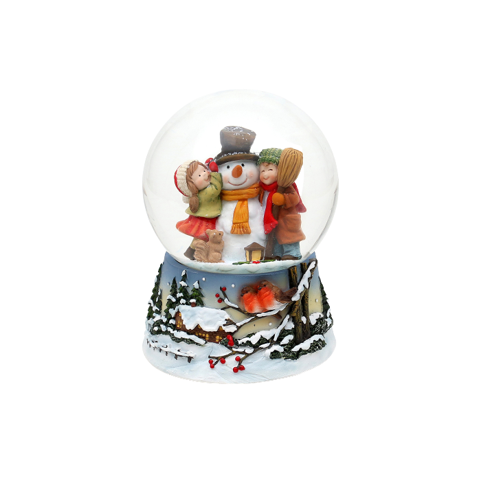Snöglob Snögubbe med barn. Två barn kramar en glad snögubbe. Sockeln har en vinterlandskap. Snögloben kan vevs upp och spela melodin: "Leise riselt der Schnee".
