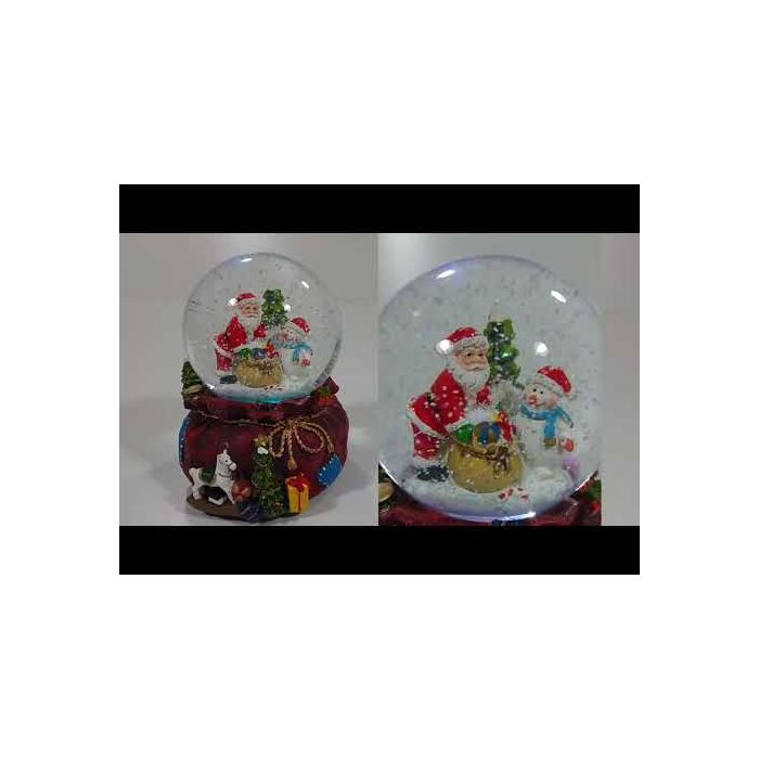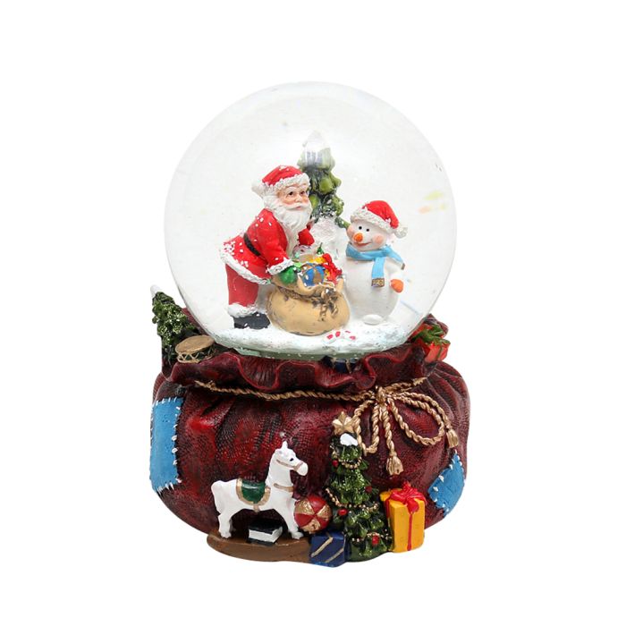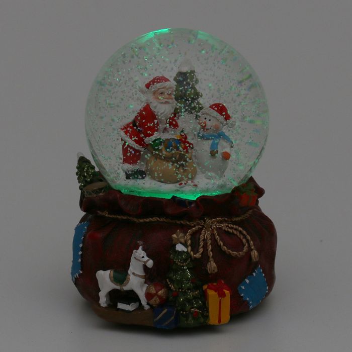 Snöglob Tomte med presentsäck är gjord av polyresin och kulan är gjord av glas. Denna snöglob har LED-ljus och musik. När den är tänd byter ljuset färg och det skapas en glitterstorm i kulan. Adapter ingår inte.