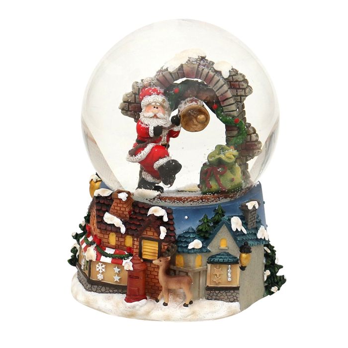 Snöglob Jultomte med klocka är gjord av polyresin och globen är gjord av glas. Denna snöglob kan spela musik. Den spelar melodin "Santa Claus is coming to town".