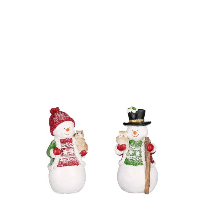 Mycket detaljerade glada snögubbar som bär ytterkläder och roar sig med skogsdjur. Mysig vinterfigur att dekorera med under de långa vintermånaderna. Välj mellan röd hatt och ekorre eller svart hatt och uggla.