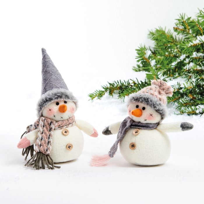 Glada och mjuka snögubbar med halsdukar och mössor med fuskpäls på kanten i grå och rosa färger. Ställ snögubben på fönsterbrädan eller på matbordet och njut den hela vintern utan att riskera att den har smält bort dagen efter.
