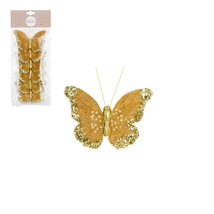 Fjärilar i mörk guldfärg och med vingar med guldglittermönster på. Fjärilarna har en liten klämma så att de enkelt kan fästas på servetter, grenar eller dekorationer.