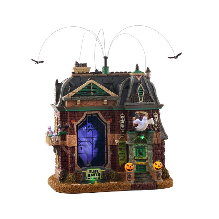 Black Raven herrgård är en stor och läskig gård med ett vackert lila ljus i fönstret och högt flygande kråkor. Fasaden har både spöken och pumpor.