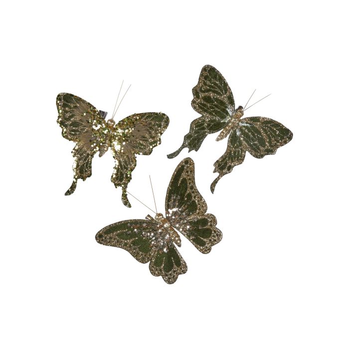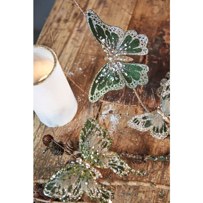 Fjärilar i gröna nyanser med vacker dekoration från Speedtsberg. Fjärilarna har klämmor så att de kan fästas på grenar, kransar, dekorationer, servetter mm. Fjärilen säljs assorterad med små skillnader i färgnyanser och dekorationer, se bild.