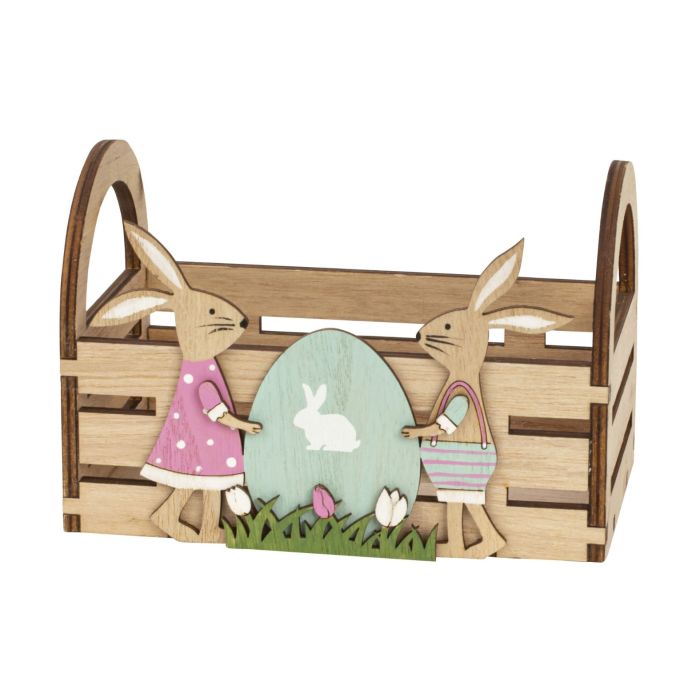 Liten träkorg med påskharar och påskägg som dekoration. Kan fyllas med till exempel påskägg eller lökväxter.