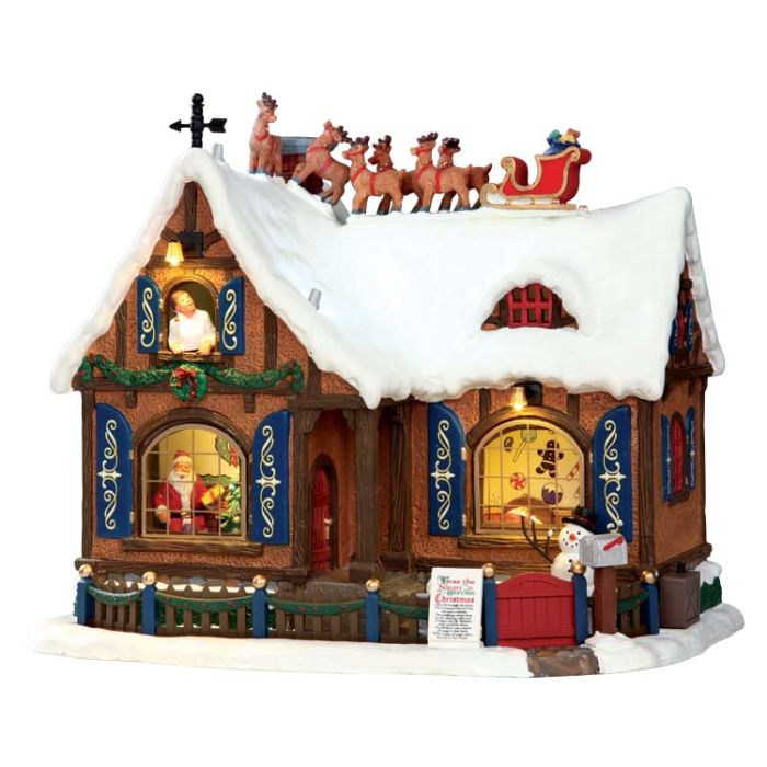 Tomten på en slädtur. Hus med många detaljer och tomtens släde på taket. Tomten har presenter i huset. Ljuset kan tändas i fönstret. Musik kan läggas till / eller en julberättelse berättad på engelska. Adapter (230 V) ingår. Mått: L 26 cm x B 18 cm x H 22 cm. Tillverkad i porslin.