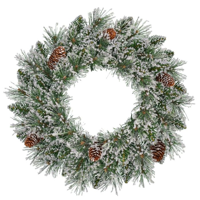 Vandans konstgjorda julgranskrans med vitt snöströssel och bruna kottar. Nålarna är hårda och robusta vilket ger en tät och mycket dekorativ krans. Kransen kan till exempel hängas på dörrar eller placeras på bord och sideboards.