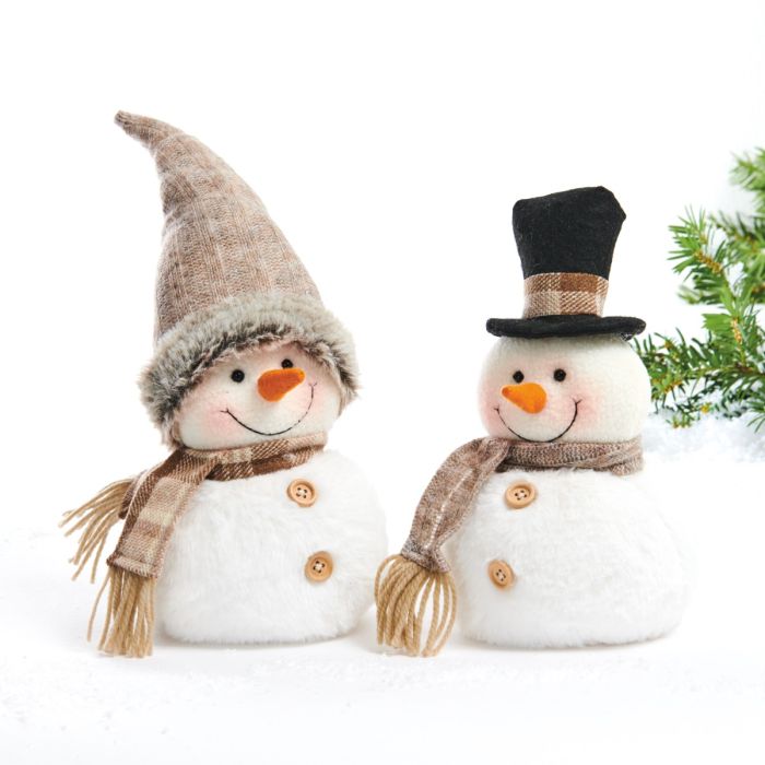 Härliga snögubbar med antingen mössa med pälskant eller hög hatt och halsduk i brunaktiga nyanser.